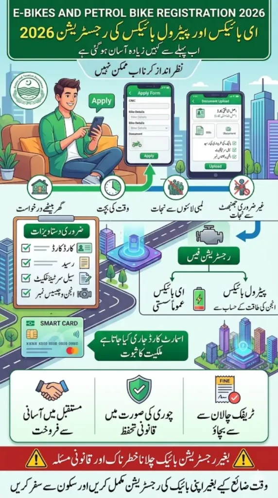 Registering E-Bikes & Petrol Bikes online in Pakistan is now simple, fast, and essential in 2026. Through the Excise and Taxation Department Punjab, users can apply online by entering CNIC, uploading documents, and paying the required fee. Both e-bikes and petrol bikes follow a similar process, but costs may vary based on type and engine capacity.