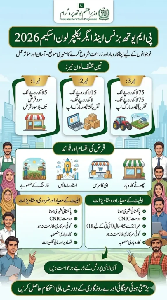 The Prime Minister’s Youth Programme offers a powerful opportunity in 2026 through the PM Youth Loan Scheme, helping young Pakistanis start businesses and invest in agriculture. With loan tiers ranging from interest-free amounts up to PKR 500,000 to larger financing up to PKR 7.5 million at low markup, the scheme is designed for startups, SMEs, and farmers.