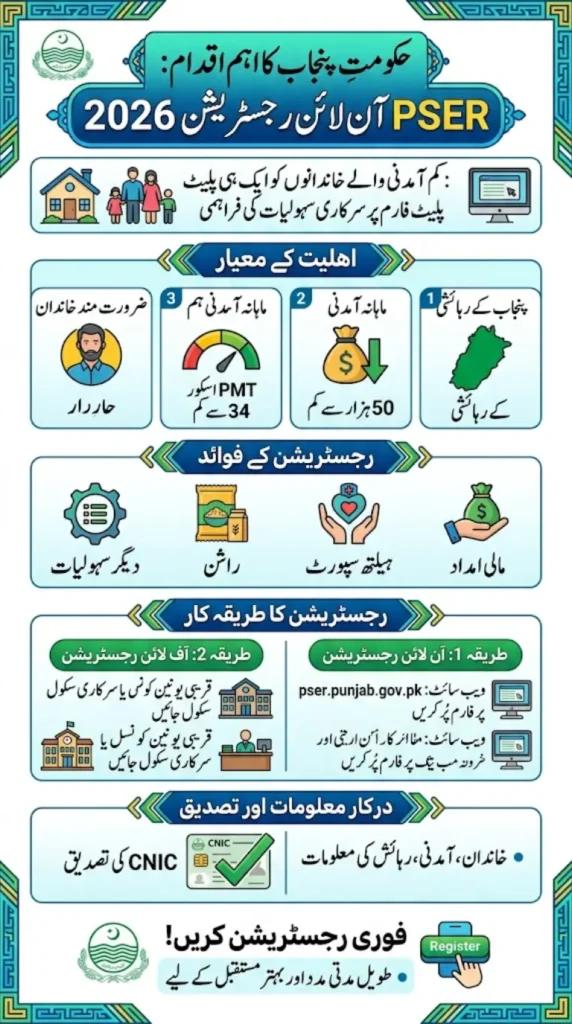 PSER Online Registration 2026 is a major initiative by the Punjab government to support low-income families through a centralized system. Eligible applicants, including residents of Punjab with income below Rs. 50,000 and PMT score under 34, can apply online via the official portal or offline at local centers.