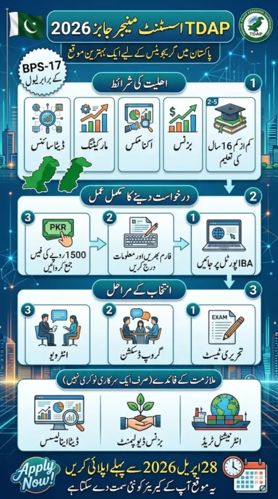 TDAP Assistant Manager Jobs 2026 offer a great opportunity for graduates to apply online and start a professional career at a BPS-17 equivalent level. Candidates with 16 years of education in fields like Business, Economics, or Data Science can apply through the IBA portal by filling out the form, submitting details, and paying a Rs. 1,500 fee.